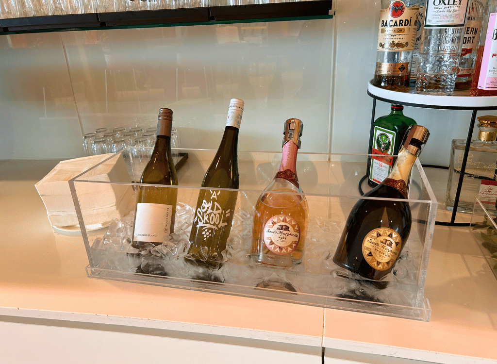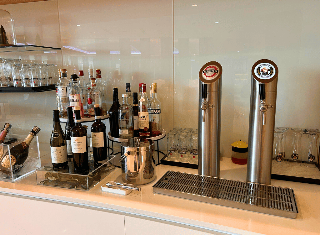 The Air Canada Frankfurt Airport Lounge has self pour alcohol on the buffet counter. There was a wide variety of alcohol. This included beer on tap, wine, prosecco and spirits.