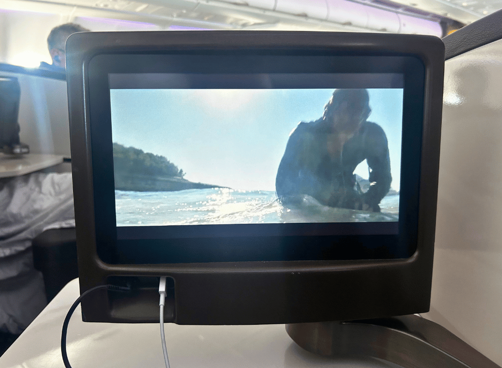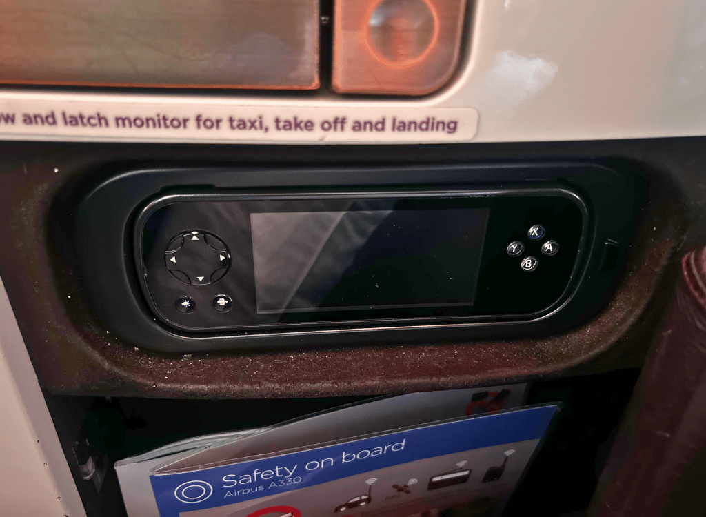 At the side of the seat, is a wall between you and the seat next to you. The TV screen is here. You can press a button to pop the TV screen out. The screen is pretty small. The same size as the TV in the economy seat!
