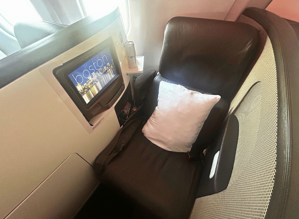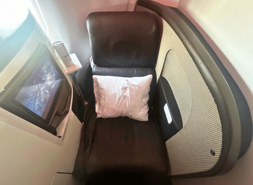 British Airways have a reverse herringbone seat in their business class. They have a privacy door too. My review of British Airways Business Class is here. I was flying to Los Angeles on that occasion. It was a great flight with BA. The seat was comfy, the food was good and the alcohol was premium.