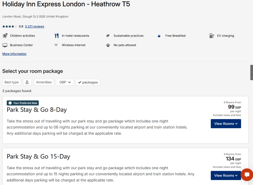 I just priced up a hotel with the IHG link. The Holiday Inn Express Heathrow T5 was charging £99 for 1 night’s stay and 8 days parking. They also charge £134 for 1 night’s stay and 15 days parking. View screenshot above
