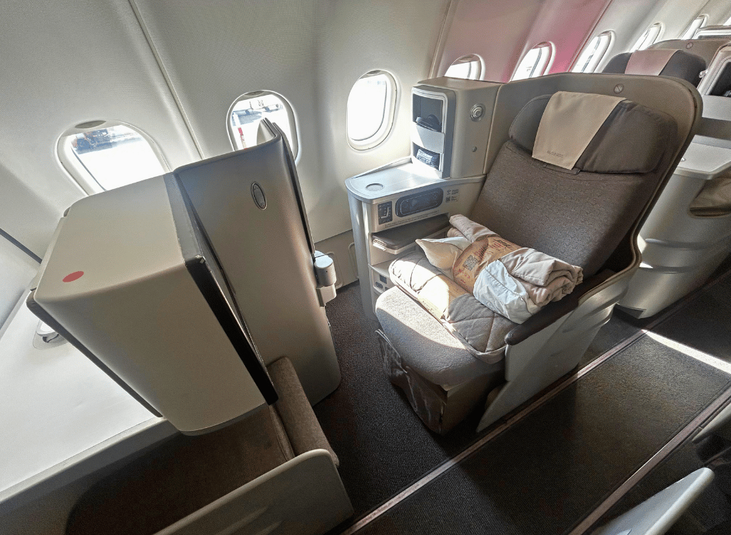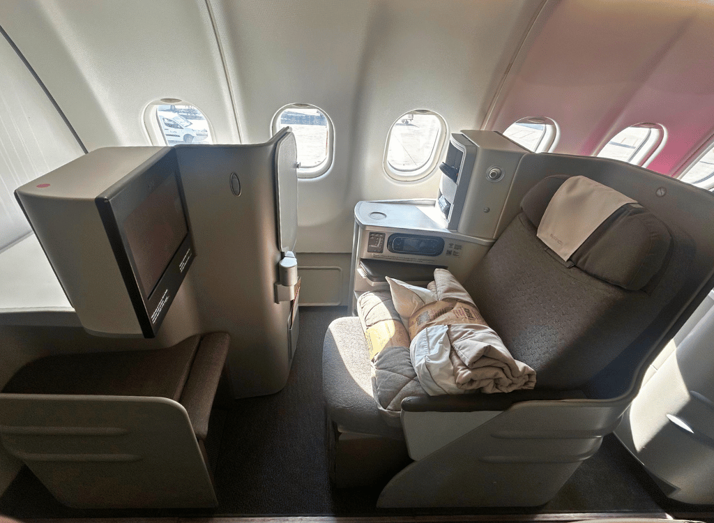 Iberia Business Class cabins have a staggered layout. With four seats across each row. Every seat has aisle access. Every seat reclines to a flat bed. The seat was good, although it did lack privacy.